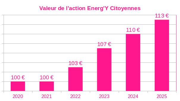 Ces augmentations sont votées chaque année lors de nos assemblées générales, sous la forme de primes d’émission. Ces primes augmentent la valeur des actions déjà acquises et fixent le nouveau prix des actions (113 € en juin 2025) et sont calculées au regard de l’évolution annuelle de notre portefeuille de centrales solaires en activité.