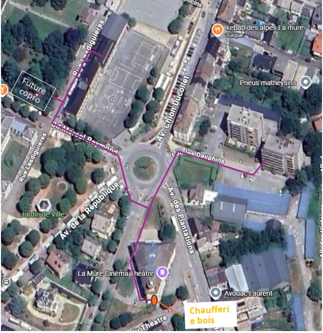 énergie pour le Théâtre et le groupe scolaire des Capucins. Se trouvent sur ce périmètre un immeuble de la copropriété Les Dauphins 2, qui sera également desservi (le 2ème immeuble de la copro a une chaudière trop récente) ainsi qu’une nouvelle copropriété en construction sur 2026-2027.
