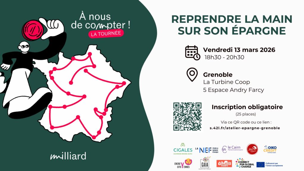 À Grenoble, le collectif de finance solidaire, Grenansol, co-organise 2 ateliers dans le cadre de la tournée « à nous de compter ». Lancée par l’opération milliard, cette tournée s’adresse à toute personne souhaitant comprendre le système financier, comment aligner son épargne avec ses valeurs… et comment, ensuite, lui donner encore plus de pouvoir !