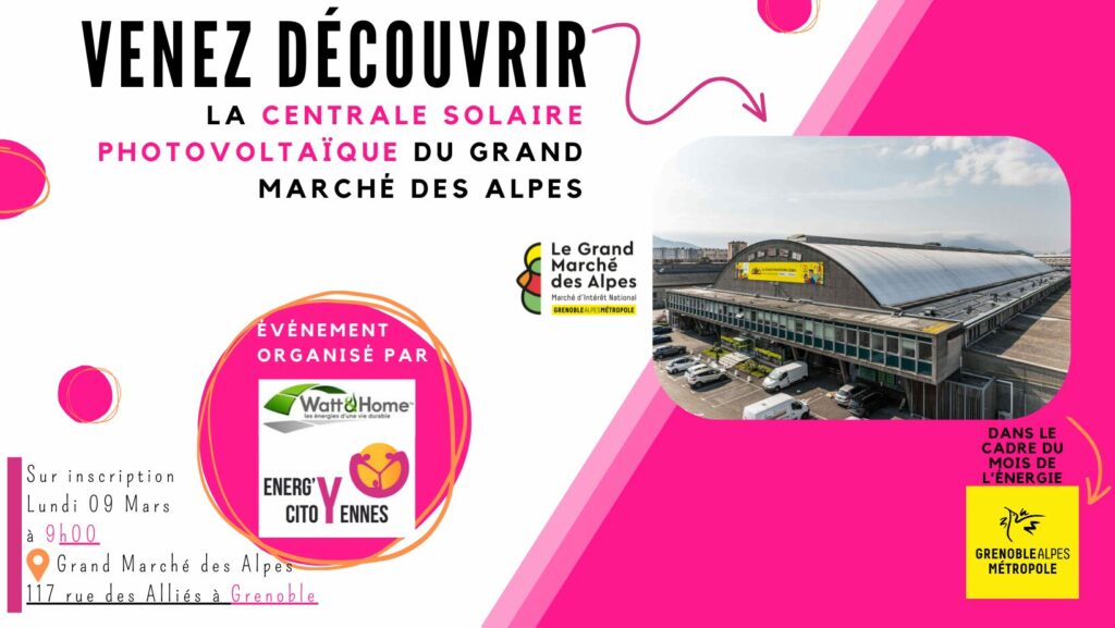 Energ’Y Citoyennes organise en collaboration avec l’installateur Watt & Home et le Grand Marché des Alpes, une visite de la centrale solaire construite en 2025 sur les toitures hautes du Marché d’Intérêt National de Grenoble Alpes Métropole.