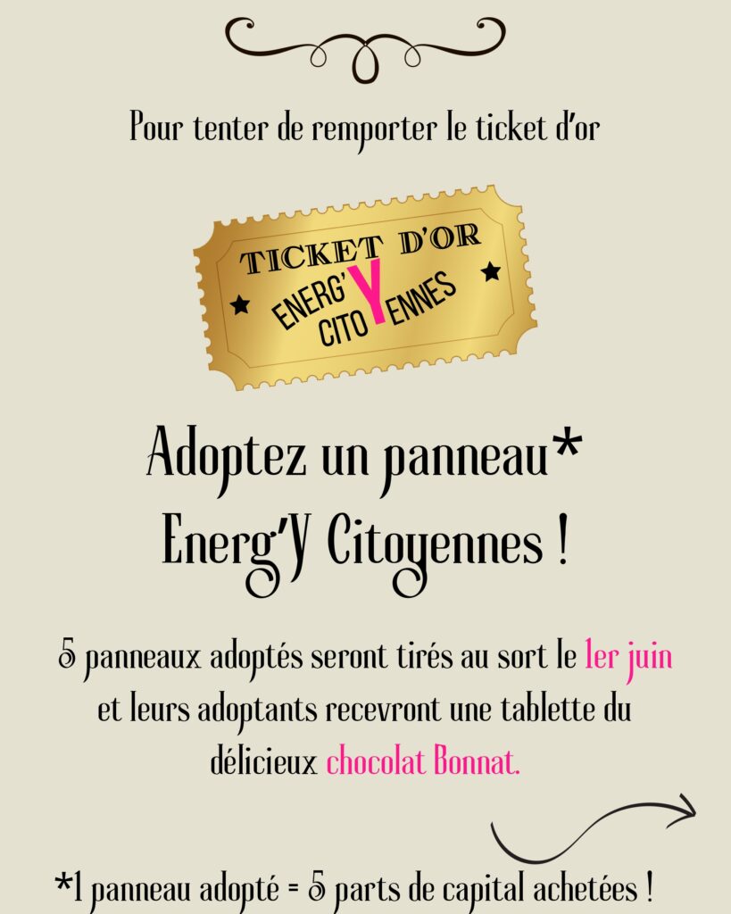 Petit rappel chocolaté car il reste 4 semaines pour participer à notre tirage au sort en adoptant un panneau solaire sur une de nos toitures et ainsi devenir producteur d’énergie renouvelable avec votre épargne ! 1 panneau adopté = 5 parts de capital (soit 5 * 113 euros hors frais de souscription de 1%).